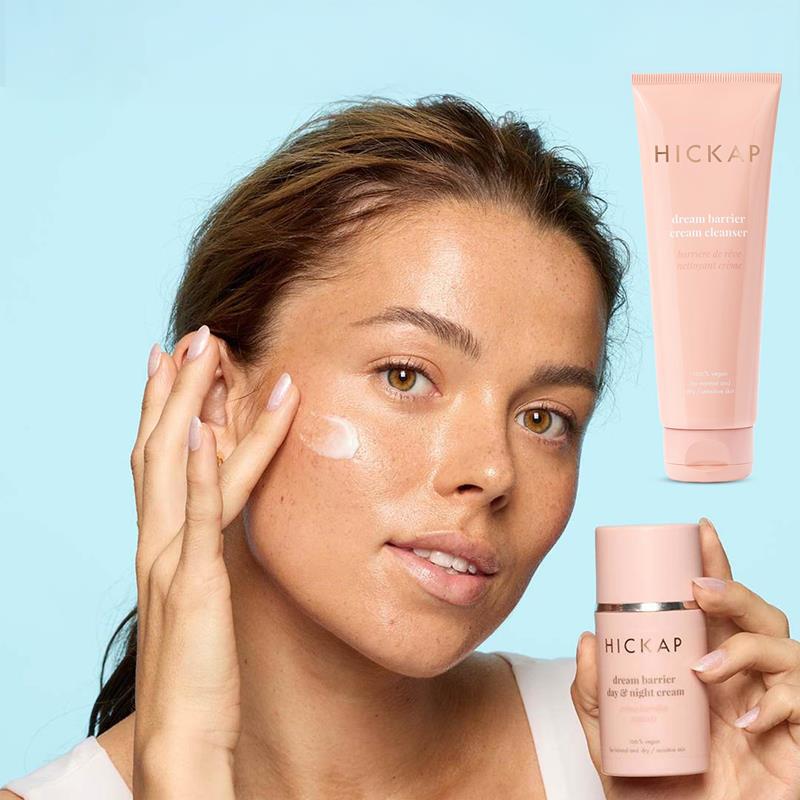 Hickap. Två hudvårdsprodukter från svenska Hickap. Ansiktsrengöringen (125 ml) avlägsnar effektivt makeup, smuts och överskottsfett utan att torka ut huden. Berikad med niacinamid och prebiotika. Krämen (50 ml) är en barriärstärkande och återfuktande 24-timmarskräm som ger näring och skydd. Hickaps produkter är veganska och cruelty free.