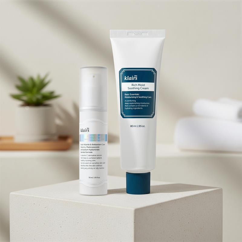 Freshly Juiced Vitamin Charging Serum 30 ml: Verkar utjämnande och ger en omedelbar lyster. Djupt återfuktande och uppstramande på huden. Rich Moist Soothing Cream 80 ml: Detta är en djupt återfuktande kräm speciellt utformad för känslig hud. Klairs är ett koreanskt, prisvinnande märke som grundades 2009 och som har en unik och okomplicerad syn på hudvård.