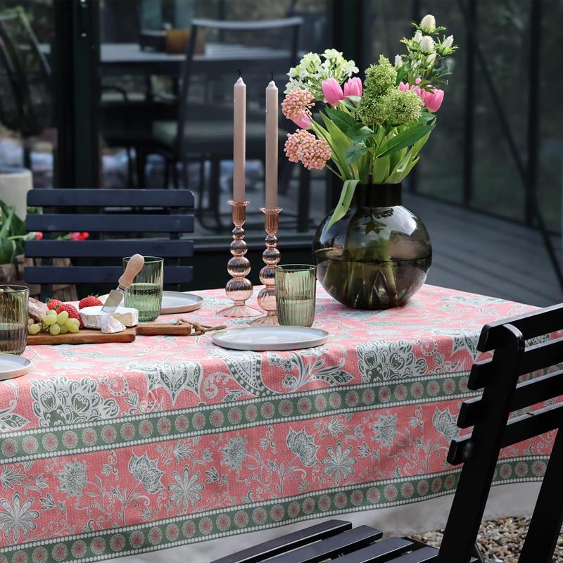 The Modern Pharmacy. Ge ditt matbord en elegant och färgstark uppgradering med denna vackra bordduk i måtten 120 x 200 cm. Med sitt detaljerade blommönster i harmoniska nyanser av ljus korall, rosa, sand och grönt skapar den en varm och inbjudande atmosfär vid varje tillfälle. Det slitstarka materialet säkerställer att den behåller sin skönhet även efter upprepade tvättar.