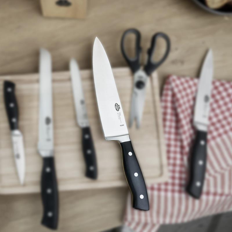 Ballarini. En kvalitativ, smidd kockkniv i tyskt rostfritt stål i tidlös klassisk italiensk design. Handtaget är ergonomiskt utformat med nitar för extra hållbarhet. Bladet är smitt i stål till en hårdhet av ca. 57 HRC med en slipvinkel på 30°. Total längd: 33,5 cm. Längd knivblad: 20 cm. Längd handtag: 13,5 cm. Bredd handtag: 2,1 cm. Bredd knivblad: 0,20 cm. Vikt: 0,239 kg.