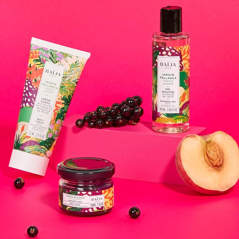 En kroppskräm 75 ml som består av en blandning av svartvinbärsolja, persikokärnolja och jojobaester. En skonsam duschgel 100 ml med vegetabilisk kokosolja. Innehåller minst 96 % naturliga ingredienser och är dermatologiskt testad. En bodyscrub 50 g med välgörande ingredienser: havssalt, socker, extrakt från svarta vinbär och persikokärnor.