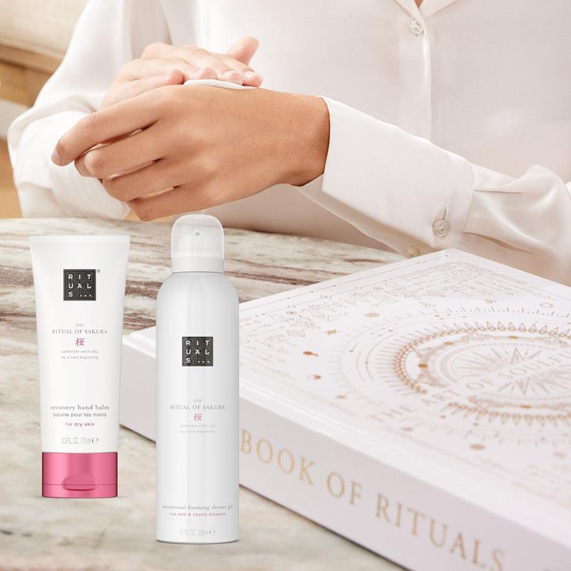 Rituals. Duschskum 200 ml: Har en förnyande doft av körsbärsblomma och ekologisk rismjölk och använder en unik teknologi för att förvandla gelen till ett silkeslent skum. Handkräm 70 ml: Speciellt utvecklad för torra händer och innehåller aktiva, mikrobiomvänliga ingredienser som effektivt stärker hudbarriären, balanserar huden och håller den hälsosam.